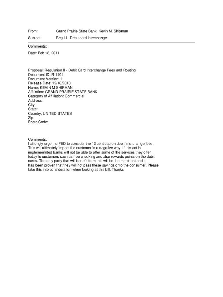 From:Grand Prairie State Bank, Kevin M. ShipmanSubject:Reg I Debit card InterchangeComments: Date: Feb 18, 2011Proposal: Regulation II Debit Card Interchange Fees and Routing Document ID: R1404 Document
