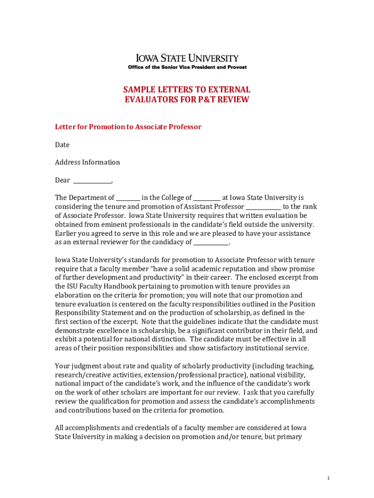 SAMPLE LETTERS TO EXTERNAL EVALUATORS FOR P&T REVIEW Letter for Promotion to Associate Professor Headdress Information Dear, The Department of in the College of at Iowa State University is considering