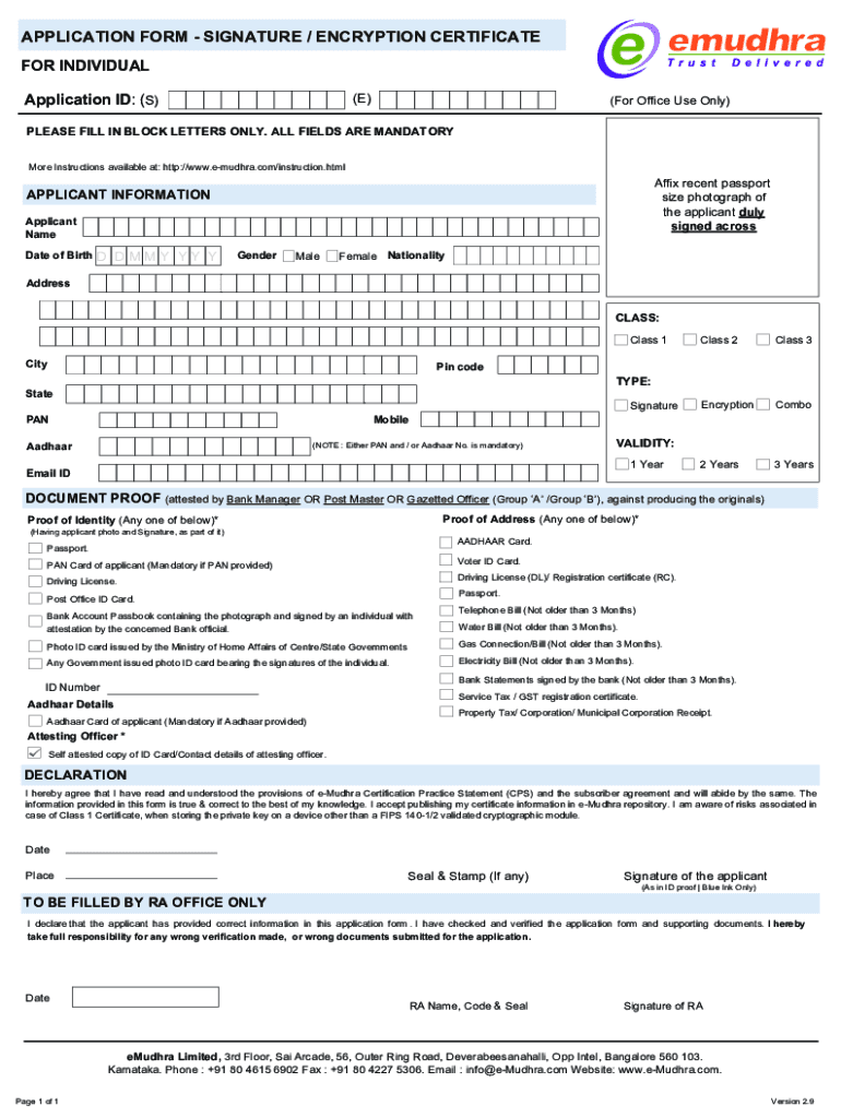 APPLICATION FORM SIGNATURE / ENCRYPTION CERTIFICATE FOR INDIVIDUAL (E)Application ID: (S)(For Office Use Only)PLEASE FILL IN BLOCK LETTERS ONLY. ALL FIELDS ARE MANDATORY More Instructions available