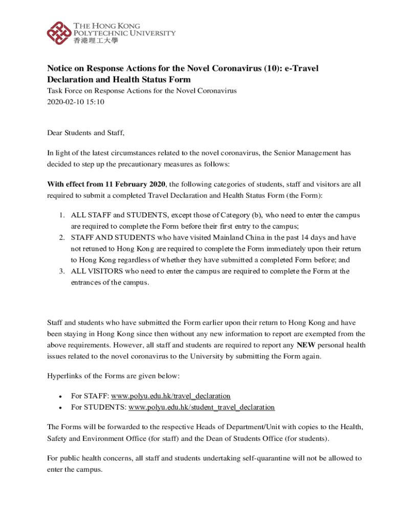Notice on Response Actions for the Novel Coronavirus (10): travel Declaration and Health Status Form Task Force on Response Actions for the Novel Coronavirus 20200210 15:10Dear Students and Staff,