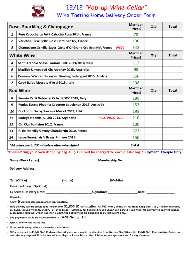 12/12 Popup Wine Cellar Wine Tasting Home Delivery Order Form Member Price rose, Sparkling & ChampagneTotalQtyTotalQtyTotal781Pere Cache Le Petite Cache Rose 2014, France2Varichon Clerk Selling Rose