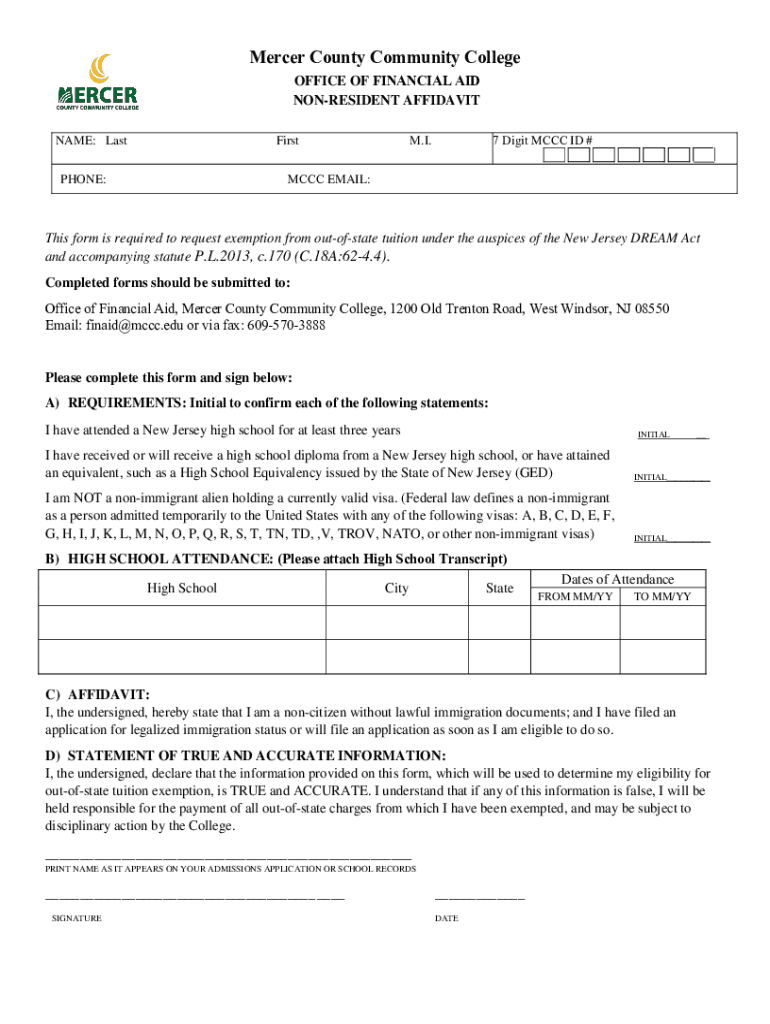 Mercer County Community College OFFICE OF FINANCIAL AID NONRESIDENT AFFIDAVIT NAME: LastFirst7 Digit CCC ID #M.I.CCC EMAIL:PHONE:This form is required to request exemption from outofstate tuition