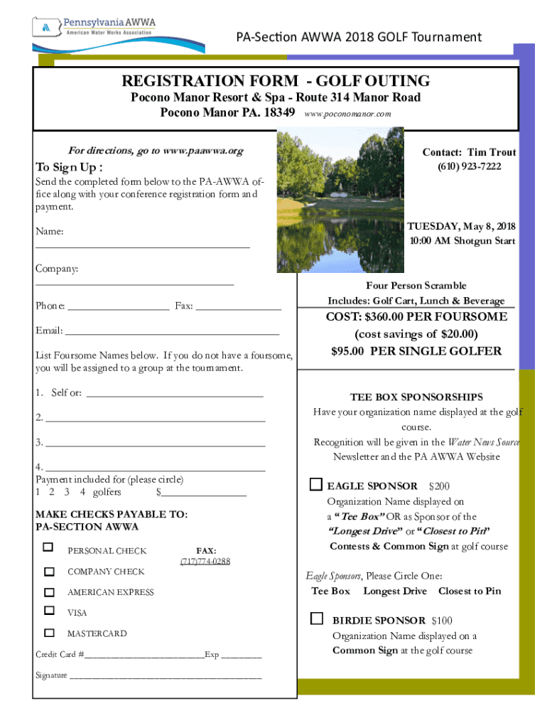 Section AWA 2018 GOLF TournamentREGISTRATION FORM GOLF OUTING Pocono Manor Resort & Spa Route 314 Manor Road Pocono Manor PA. 18349 www.poconomanor.com For directions, go to www.paawwa.orgTo Sign