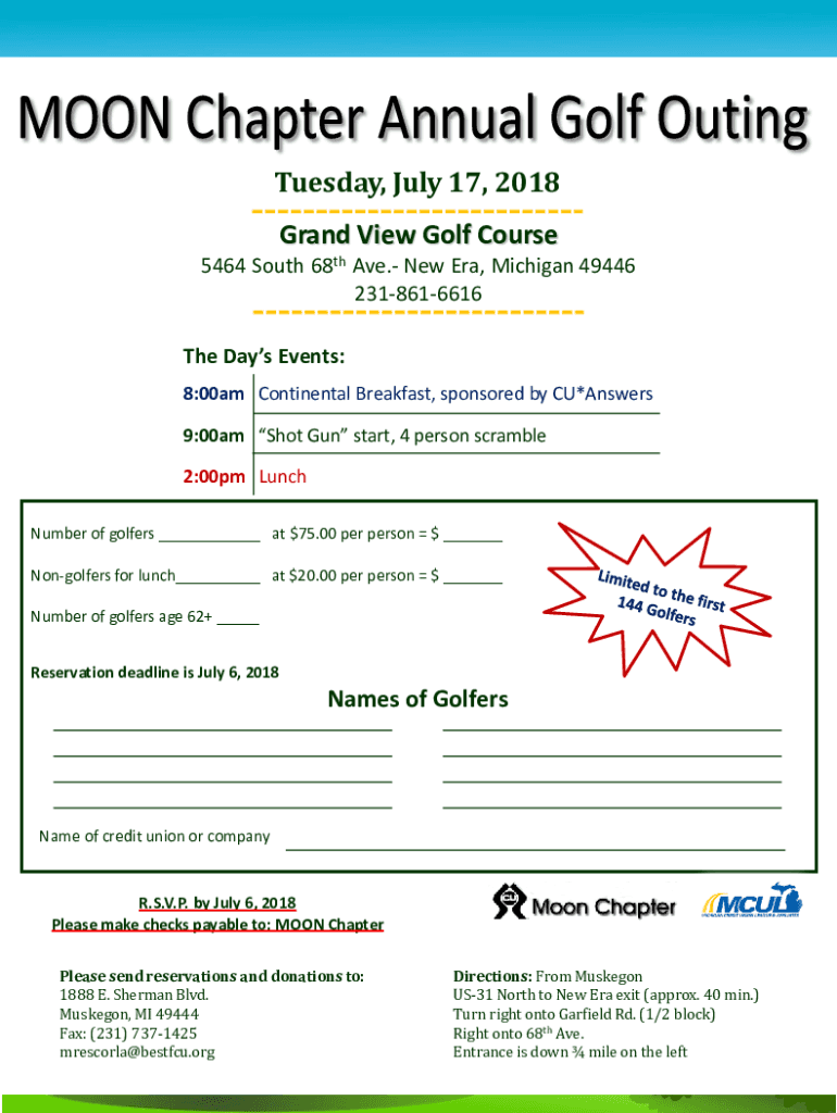 Tuesday, July 17, 2018, Grand View Golf Course 5464 South 68th Ave. New Era, Michigan 49446 2318616616 The Days Events: 8:00am Continental Breakfast, sponsored by CU×Answers 9:00am Shot Gun start,