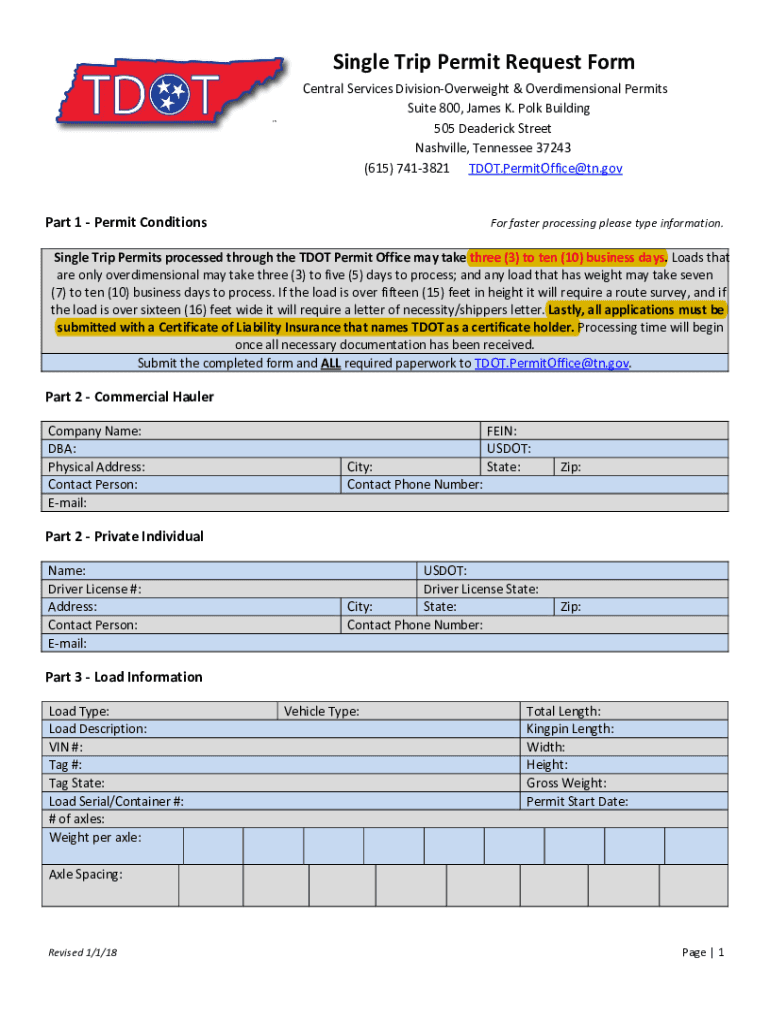 Single Trip Permit Request Form Central Services DivisionOverweight & Over dimensional Permits Suite 800, James K. Polk Building 505 Frederick Street Nashville, Tennessee 37243 (615) 7413821 DOT.