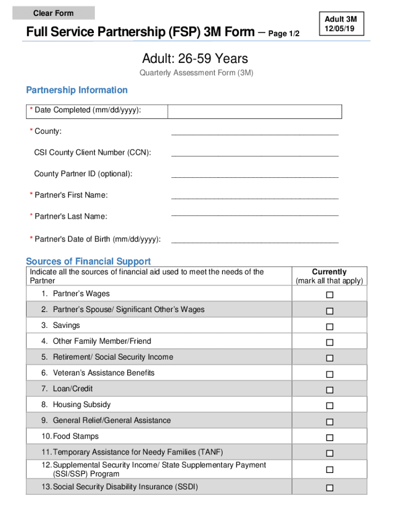 Clear Formula Service Partnership (FSP) 3M Form Page 1/2Adult 3M 12/05/19Adult: 2659 Years Quarterly Assessment Form (3M)Partnership Information * Date Completed (mm/dd/YYY): * County: CSI County