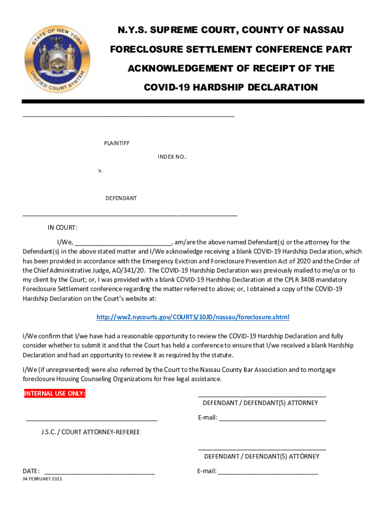 N.Y.S. SUPREME COURT, COUNTY OF NASSAU TENTH JUDICIAL DISTRICTCOVID19 EMERGENCY EVICTION AND FORECLOSURE PREVENTION ACT OF 2020 RESIDENTIAL FORECLOSURES COVID-19 HARDSHIP DECLARATION INSTRUCTIONS
