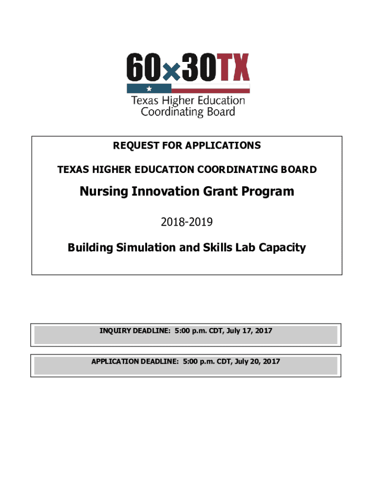 REQUEST FOR APPLICATIONS TEXAS HIGHER EDUCATION COORDINATING BOARDNursing Innovation Grant Program 20182019 Building Simulation and Skills Lab CapacityINQUIRY DEADLINE: 5:00 p.m. CDT, July 17, 2017APPLICATION