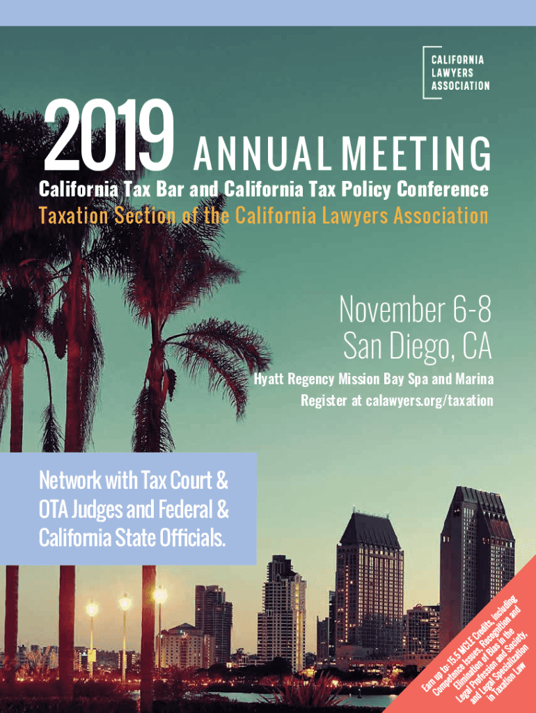 2019 A NNSA L M E TI NG California Tax Bar and California Tax Policy Conference Taxation Section of the California Lawyers Association November 68 San Diego, CA Hyatt Regency Mission Bay Spa and Marina