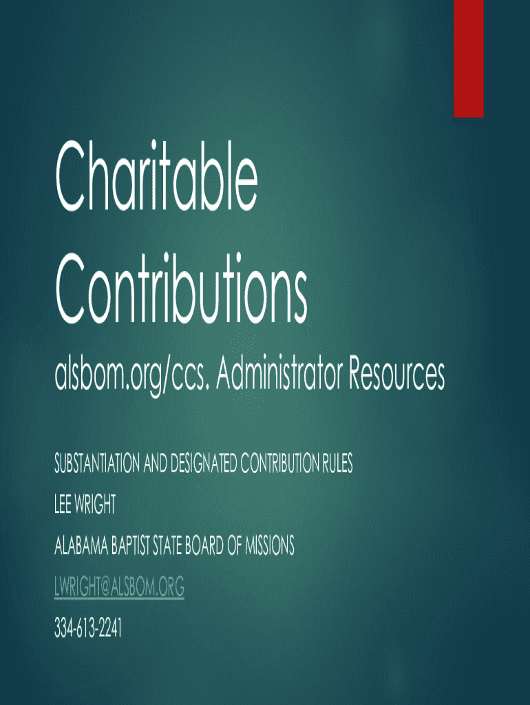 Charitable Contributionsalsbom.org/ccs. Administrator Resources SUBSTANTIATION AND DESIGNATED CONTRIBUTION RULES WRIGHT ALABAMA BAPTIST STATE BOARD OF MISSIONS LWRIGHT@ALSBOM.ORG3346132241Six requirements