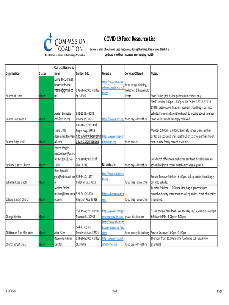 COVID19FoodResourceList Belowisalistofourmostusedresources, duringthistime. Pleasenotethislistis updatedweeklyasresourcesarechangingrapidly. BeaconofHopeOpenContactNameand Email Contacting Dona McConnell