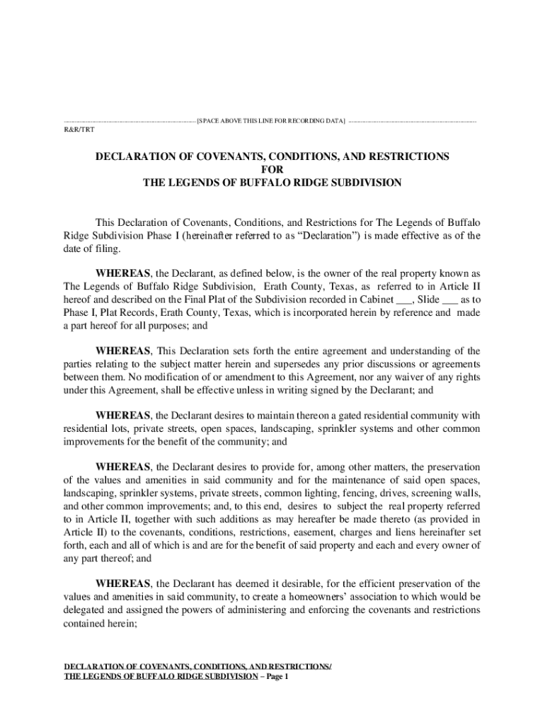 SPACE ABOVE THIS LINE FOR RECORDING DATA R&R/DECLARATION OF COVENANTS, CONDITIONS, AND RESTRICTIONS FOR THE LEGENDS OF BUFFALO RIDGE Subdivisions Declaration of Covenants, Conditions, and Restrictions