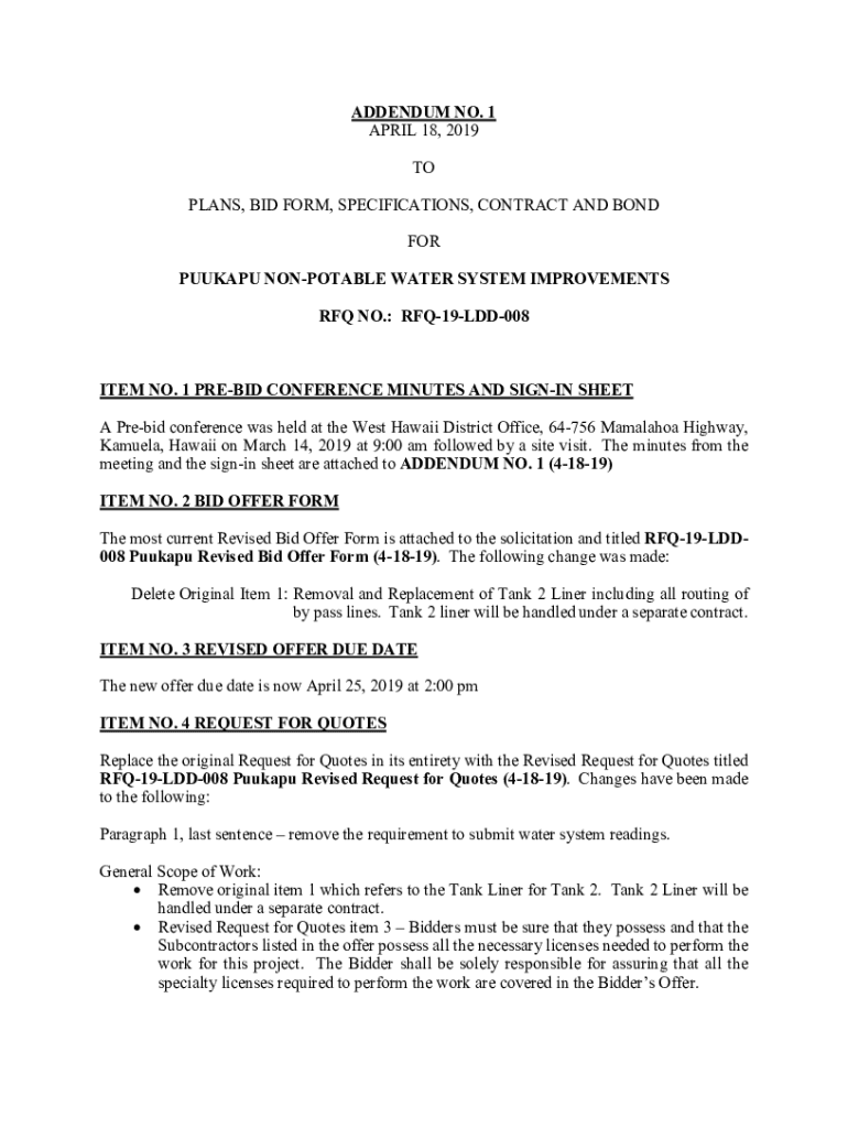 ADDENDUM NO. 1 APRIL 18, 2019, TO PLANS, BID FORM, SPECIFICATIONS, CONTRACT AND BOND FOR PUKKA NOTABLE WATER SYSTEM IMPROVEMENTS RFQ NO.: RFQ19LDD008ITEM NO. 1 PREBID CONFERENCE MINUTES AND SIGNING