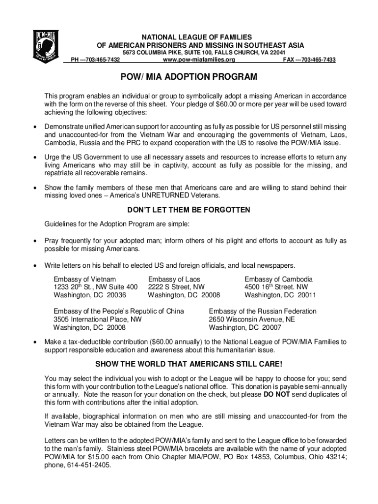 NATIONAL LEAGUE OF FAMILIES OF AMERICAN PRISONERS AND MISSING IN SOUTHEAST ASIA PH 703/46574325673 COLUMBIA PIKE, SUITE 100, FALLS CHURCH, VA 22041 www.powmiafamilies.org FAX 703/4657433POW/ MIA ADOPTION