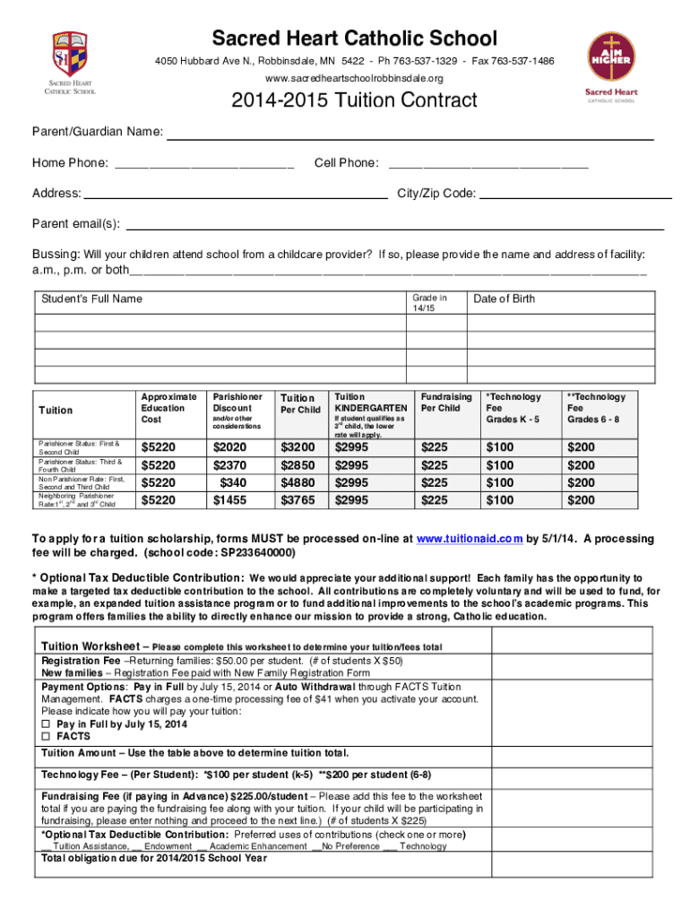 Sacred Heart Catholic School 4050 Hubbard Ave N., Robbins dale, MN 5422 pH 7635371329 Fax 7635371486 www.sacredheartschoolrobbinsdale.org20142015 Tuition Contract Parent/Guardian Name: Home Phone: