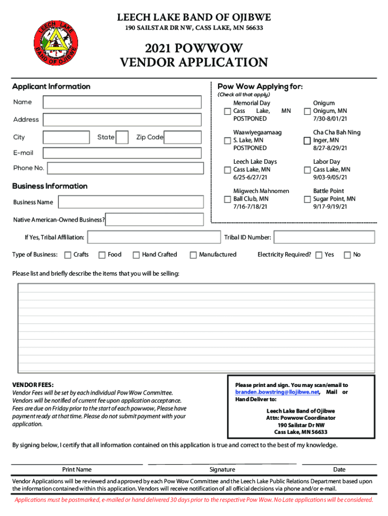 LEECH LAKE BAND OF OJIBWA 190 SAIL STAR DR NW, CLASS LAKE, MN 566332021 POWWOW VENDOR APPLICATION Applicant Information Wow Applying for: (Check all that apply)Immemorial Day Class Lake, POSTPONEDAddress