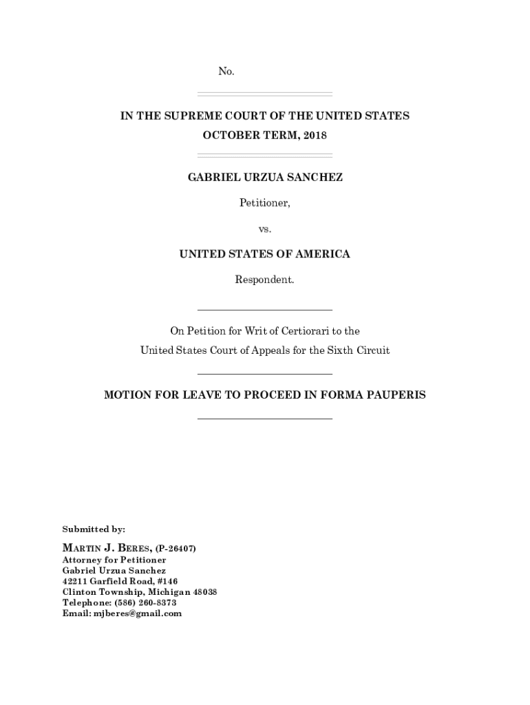 No. IN THE SUPREME COURT OF THE UNITED STATES OCTOBER TERM, 2018 GABRIEL URDU SANCHEZ Petitioner, vs. UNITED STATES OF AMERICA Respondent. On Petition for Writ of Certiorari to the United States Court