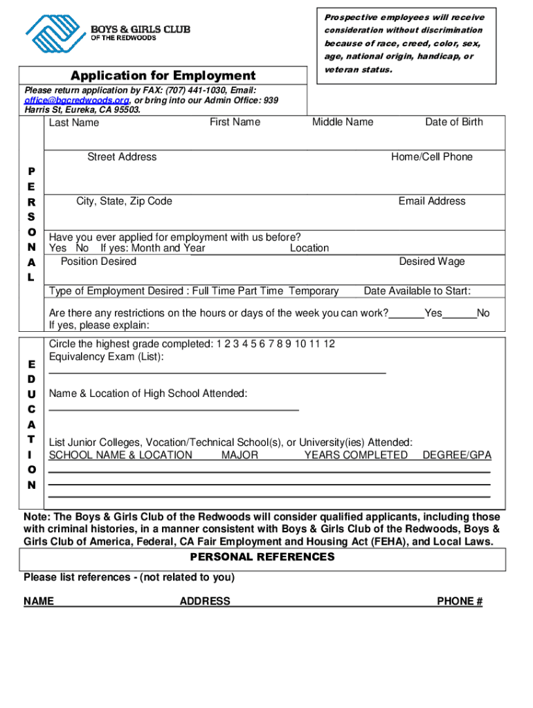 Application for EmploymentProspective employees will receive consideration without discrimination because of race, creed, color, sex, age, national origin, handicap, or veteran status. Please return
