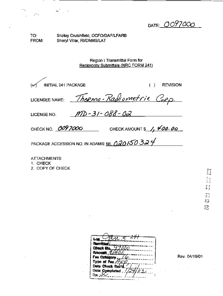 0097Xs00DATE: TO: FROM:Shirley Crutch field, CFO/DAF/FAR Sheryl Villa, RI/DAMS/Region I Transmittal Form for Reciprocity Submittals (NRC FORM 241)(Initial 241 PACKAGE()eye.LICENSEE NAME:LICENSE NO.CHECK