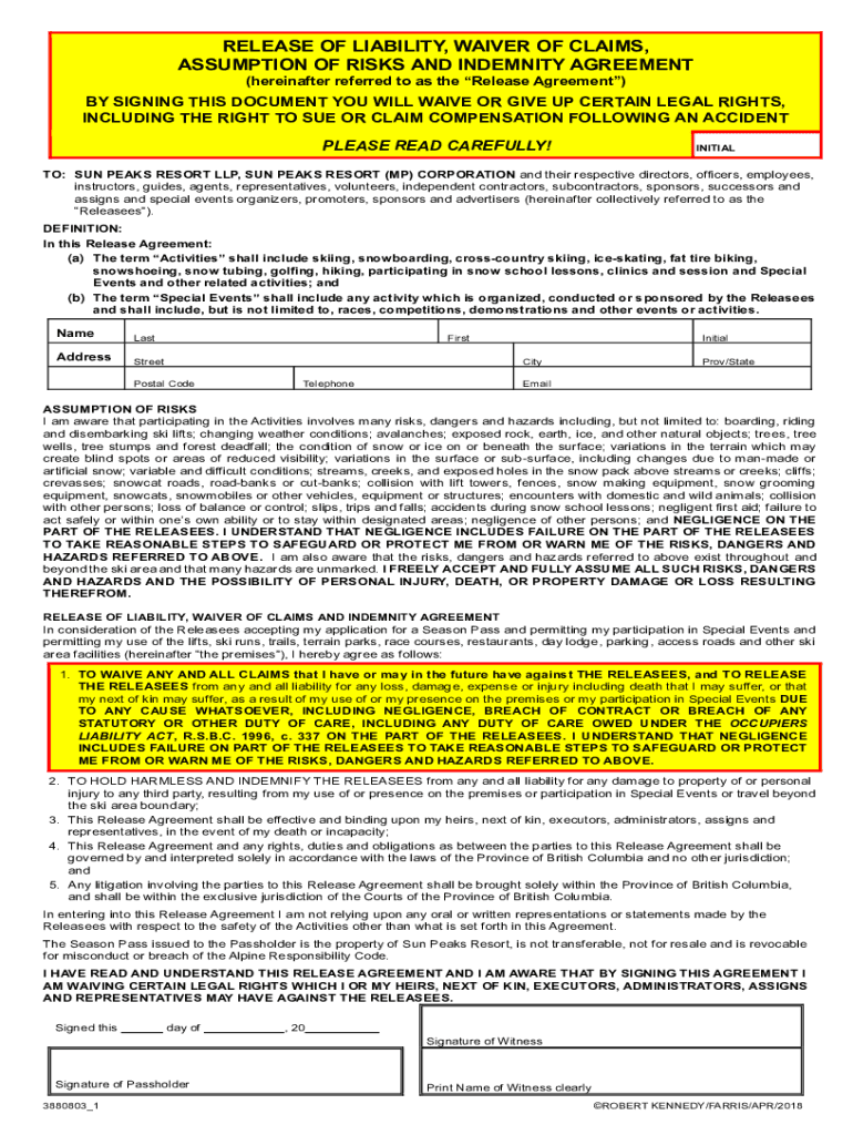 RELEASE OF LIABILITY, WAIVER OF CLAIMS, ASSUMPTION OF RISKS AND INDEMNITY AGREEMENT (hereinafter referred to as the Release Agreement)BY SIGNING THIS DOCUMENT YOU WILL WAIVE OR GIVE UP CERTAIN LEGAL