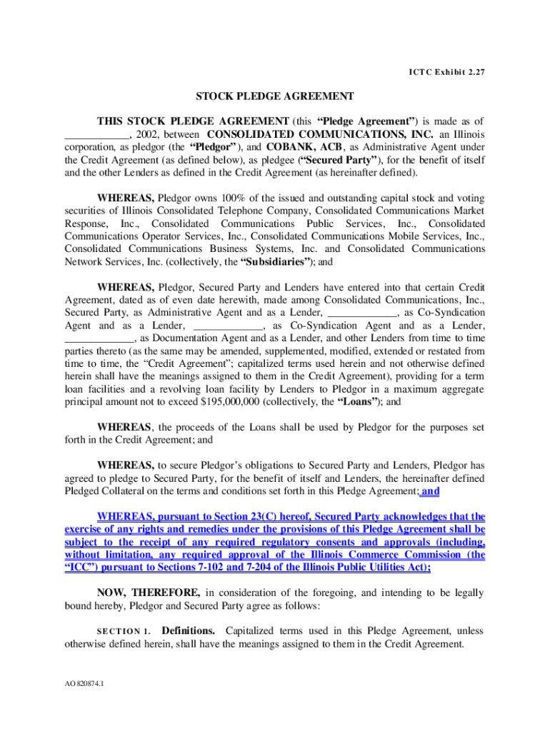 ICT Exhibit 2.27STOCK PLEDGE AGREEMENT THIS STOCK PLEDGE AGREEMENT (this Pledge Agreement) is made as of, 2002, between CONSOLIDATED COMMUNICATIONS, INC. an Illinois corporation, as pledge (the Pledge),