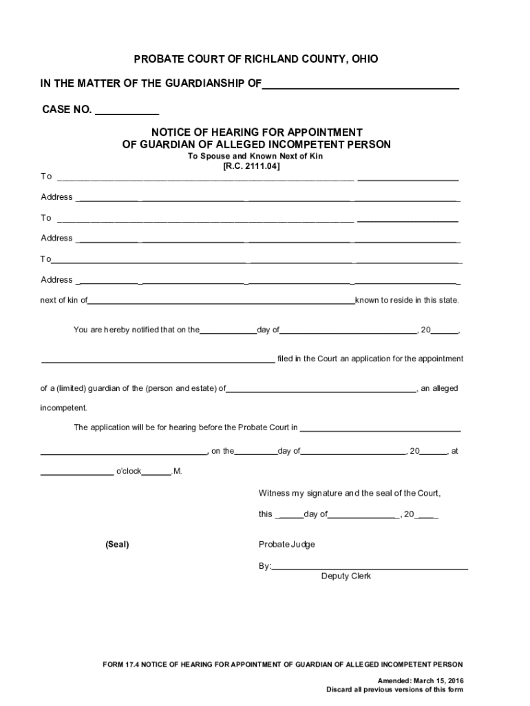 PROBATE COURT OF RICHLAND COUNTY, OHIO IN THE MATTER OF THE GUARDIANSHIP OF CASE NO. NOTICE OF HEARING FOR APPOINTMENT OF GUARDIAN OF ALLEGED INCOMPETENT PERSON To Spouse and Known Next of Kin R.C.
