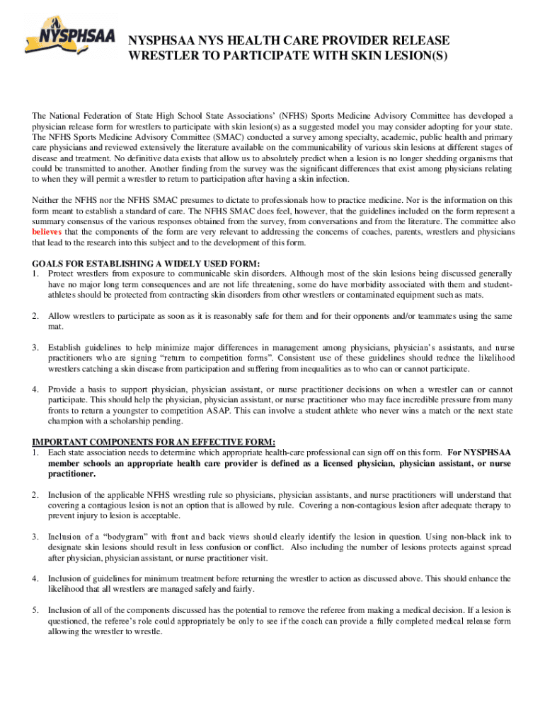 NYMPHS NYS HEALTH CARE PROVIDER RELEASE WRESTLER TO PARTICIPATE WITH SKIN LESION(S)The National Federation of State High School State Associations (NFHS) Sports Medicine Advisory Committee has developed