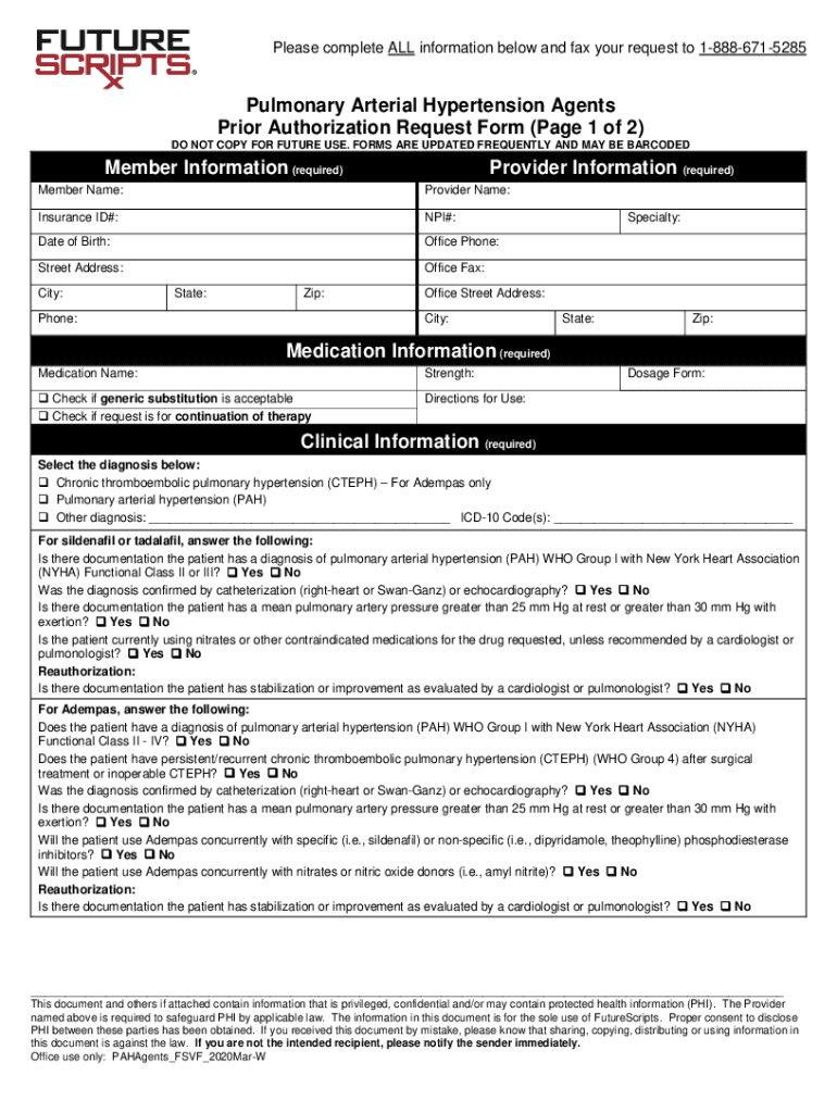 Please complete ALL information below and fax your request to 18886715285Pulmonary Arterial Hypertension Agents Prior Authorization Request Form (Page 1 of 2) DO NOT COPY FOR FUTURE USE. FORMS ARE