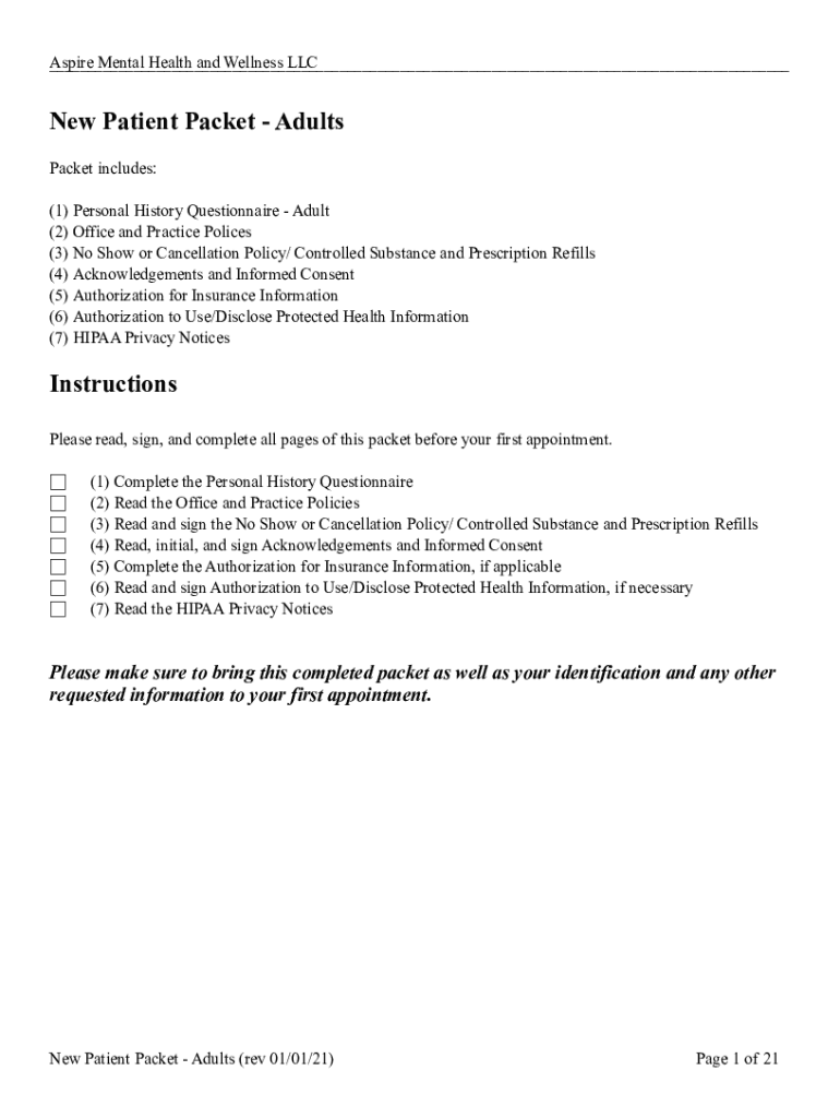 Aspire Mental Health and Wellness LLC New Patient Packet Adults Packet includes: (1) Personal History Questionnaire Adult (2) Office and Practice Polices (3) No Show or Cancellation Policy/ Controlled