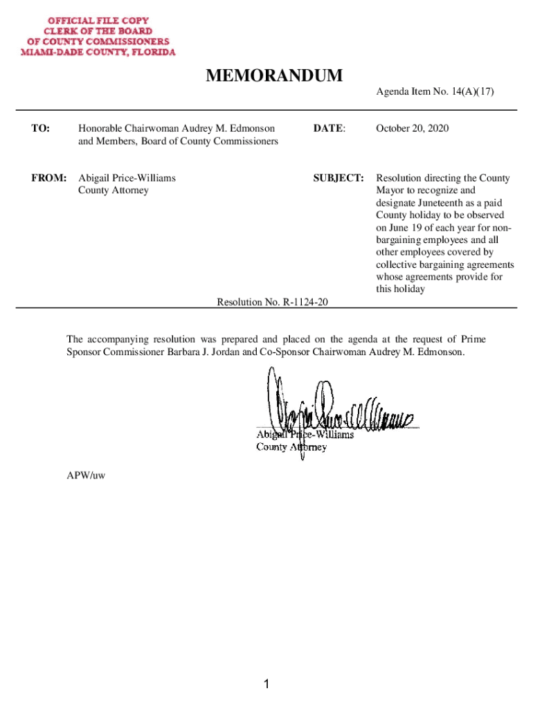 MEMORANDUMAgenda Item No. 14(A)(17)TO:Honorable Chairwoman Audrey M. Edmonson and Members, Board of County CommissionersDATE:October 20, 2020FROM:Abigail Price Williams County AttorneySUBJECT:Resolution