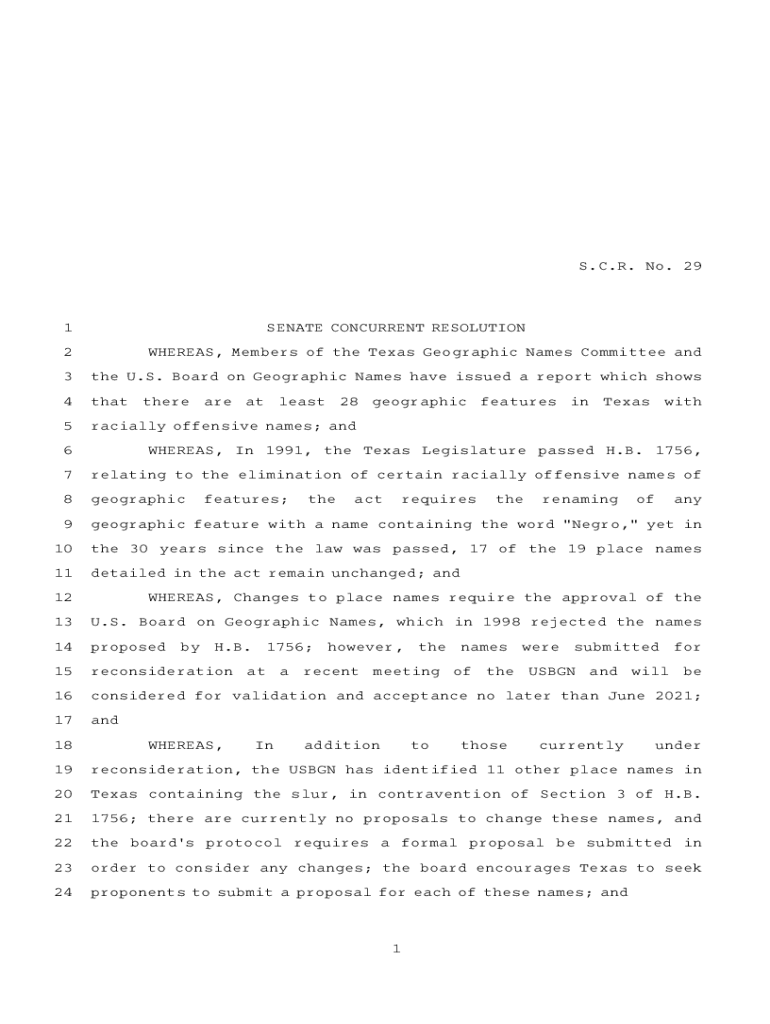 S.C.R.ANO. A29SENATE CONCURRENT RESOLUTION1 2WHEREAS, Members of the Texas Geographic Names Committee and3the U.S. Board on Geographic Names have issued a report which shows4that5racially offensive