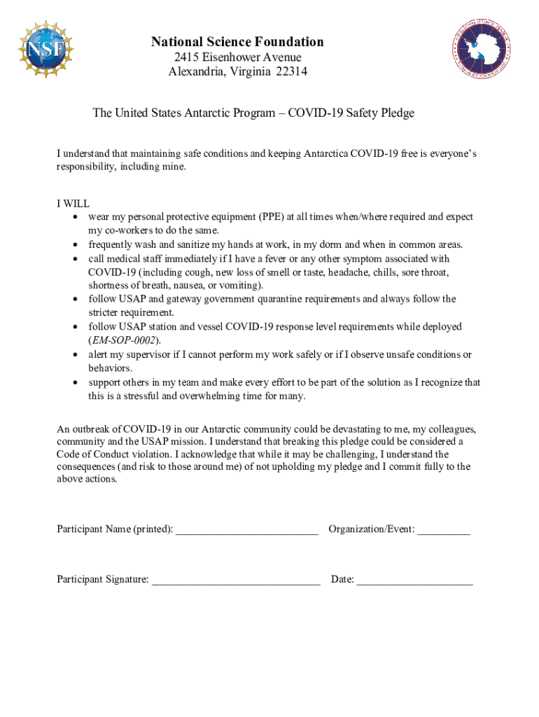 National Science Foundation 2415 Eisenhower Avenue Alexandria, Virginia 22314The United States Antarctic Program COVID-19 Safety Pledge I understand that maintaining safe conditions and keeping Antarctica