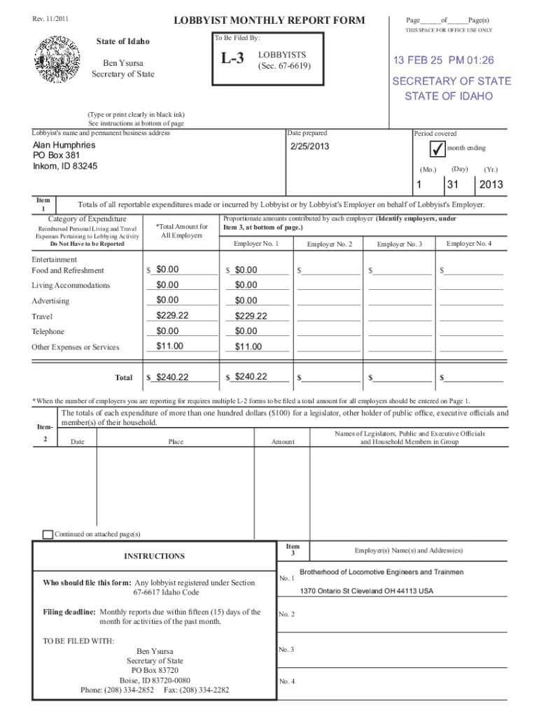 Rev. 11/2011LOBBYIST MONTHLY REPORT FORM Page of Page(s) THIS SPACE FOR OFFICE USE Only Be Filed By:State of IdahoL3Ben Yours Secretary of StateLOBBYISTS (Sec. 676619)13 FEB 25 PM 01:26 SECRETARY