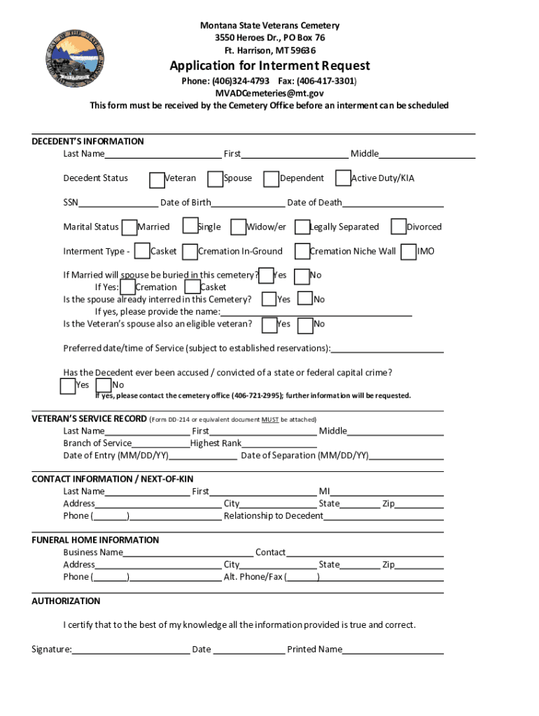 Montana State Veterans Cemetery 3550 Heroes Dr., PO Box 76 Ft. Harrison, MT 59636Application for Interment RequestPhone: (406)3244793 Fax: (4064173301) MVADCemeteries CT.gov This form must be received