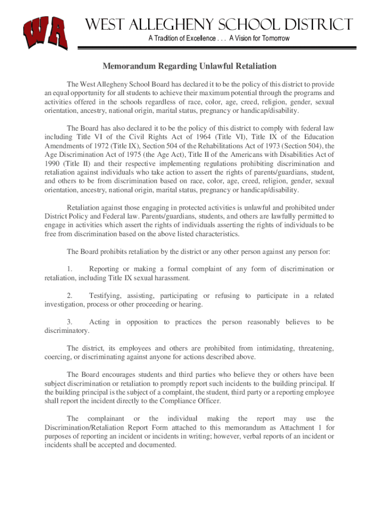 West Allegheny School District A Tradition of Excellence. . . A Vision for TomorrowMemorandum Regarding Unlawful Retaliation The West Allegheny School Board has declared it to be the policy of this