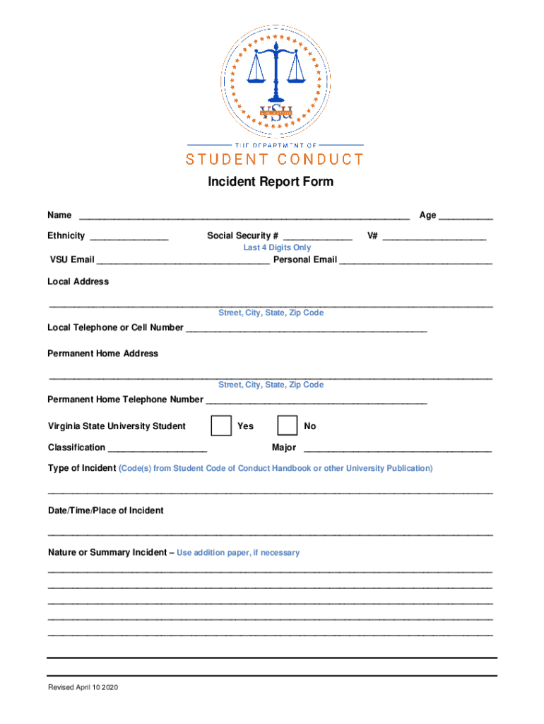 Incident Report Form Name Ethnicity Social Security # Age V# Last 4 Digits Only Email Personal Email Local Address Street, City, State, Zip Confocal Telephone or Cell Number Permanent Home Address