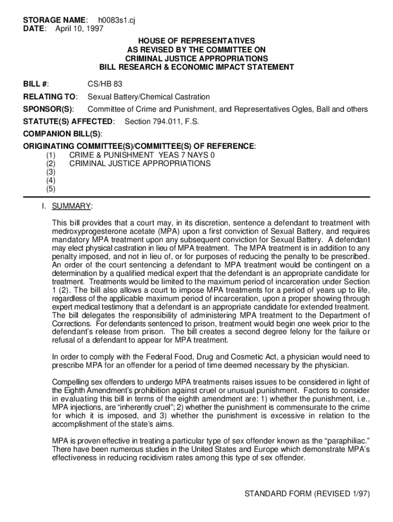 STORAGE NAME: h0083s1.CJ DATE: April 10, 1997, HOUSE OF REPRESENTATIVES AS REVISED BY THE COMMITTEE ON CRIMINAL JUSTICE APPROPRIATIONS BILL RESEARCH & ECONOMIC IMPACT STATEMENT BILL #:CS/HE 83RELATING