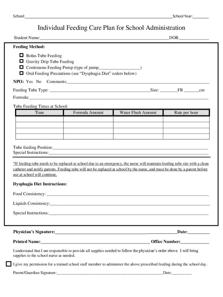 School: School Year: Individual Feeding Care Plan for School Administration Student Name: DOB Feeding Method: Bolus Tube Feeding Gravity Drip Tube Feeding Continuous Feeding Pump (type of pump) Oral