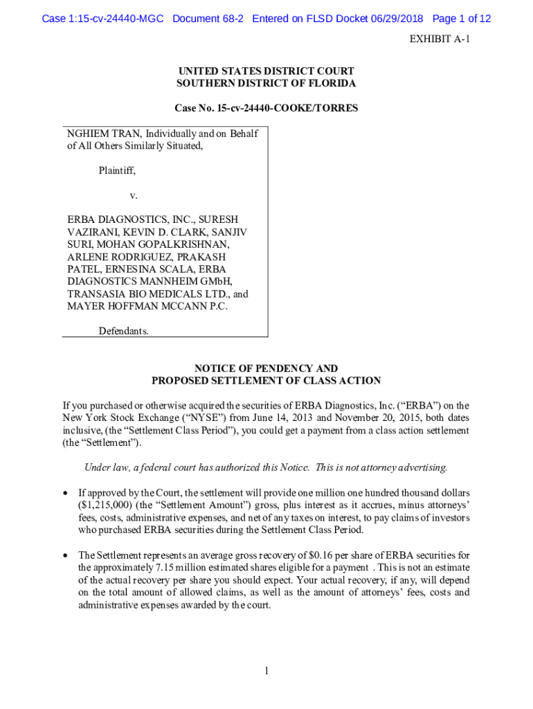 Get the free Nghiem Tran, et al. v. ERBA Diagnostics, Inc., et al. 15-CV-24440-Notice of Pendency...