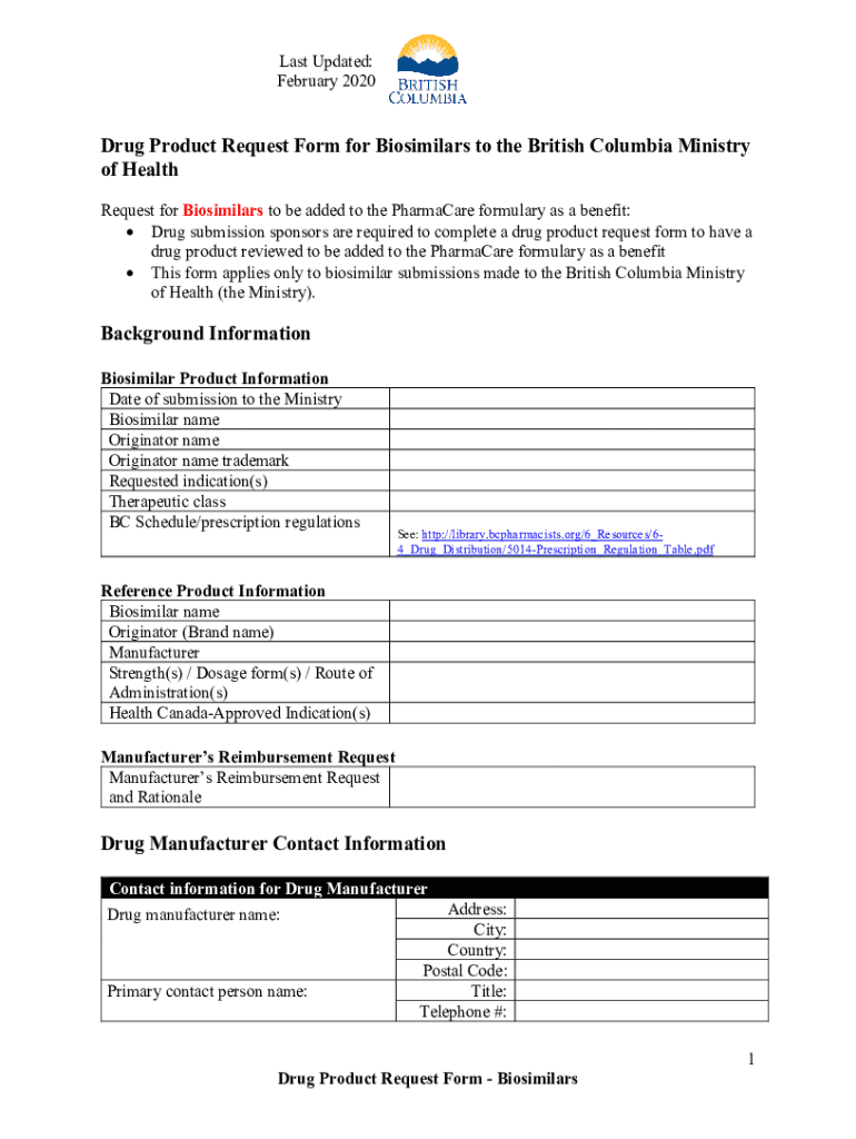 Last Updated: February 2020Drug Product Request Form for Biosimilar to the British Columbia Ministry of Health Request for Biosimilar to be added to the Pharmacies formulary as a benefit: Drug submission