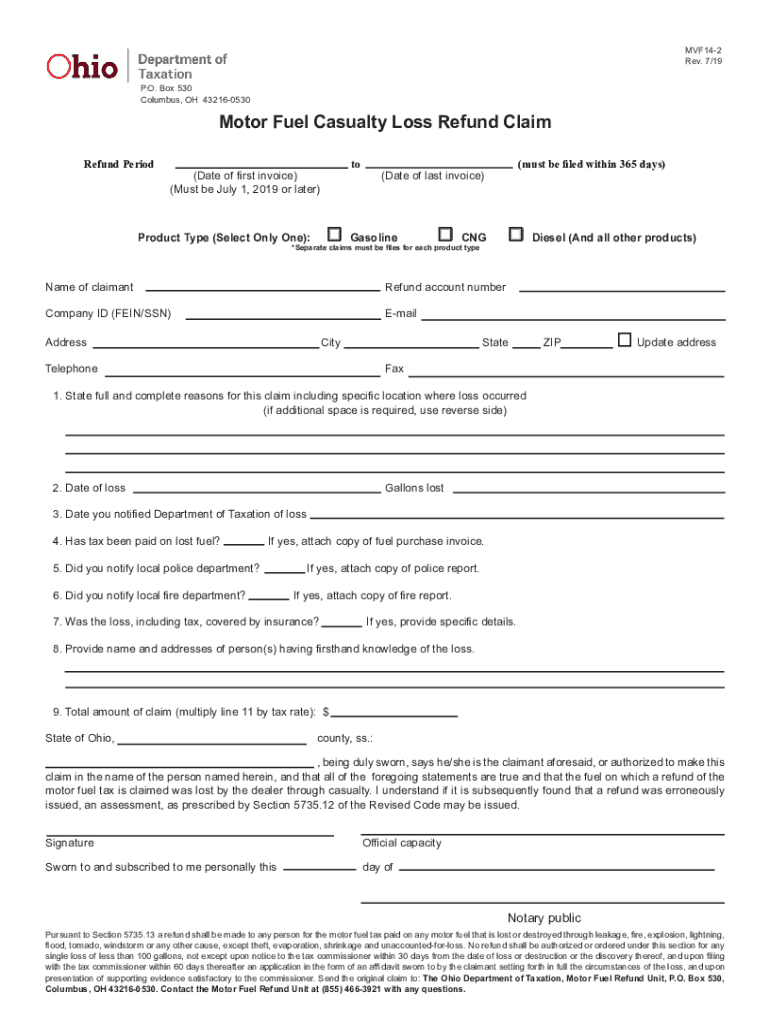 MVF142 Rev. 7/19 P.O. Box 530 Columbus, OH 432160530Motor Fuel Casualty Loss Refund Claim Refund Period to(Date of first invoice) (Must be July 1, 2019, or later)Product Type (Select Only One):Gasoline