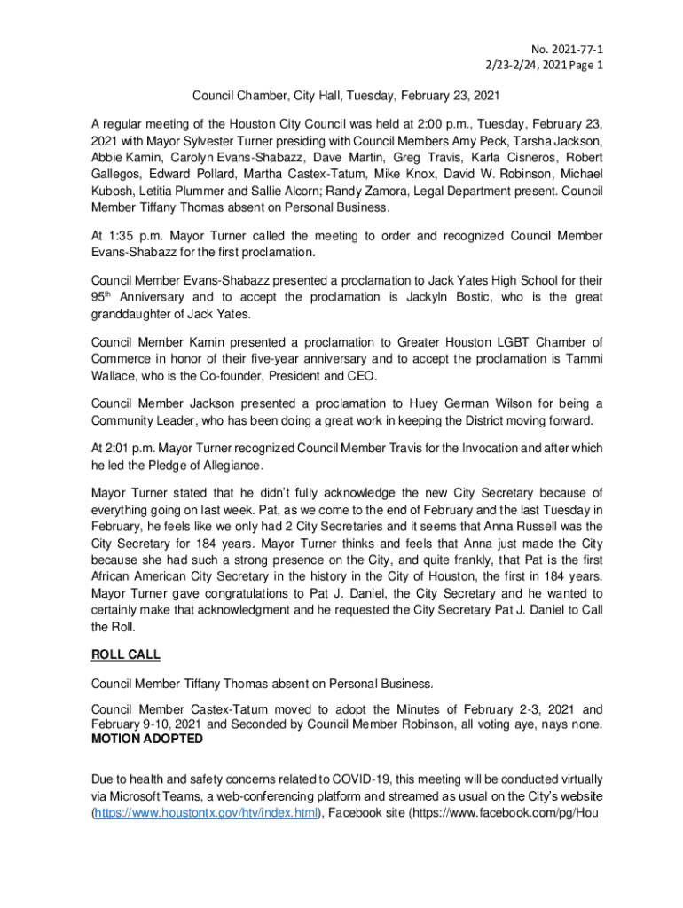 No. 2021771 2/232/24, 2021-Page 1 Council Chamber, City Hall, Tuesday, February 23, 2021, A regular meeting of the Houston City Council was held at 2:00 p.m., Tuesday, February 23, 2021, with Mayor