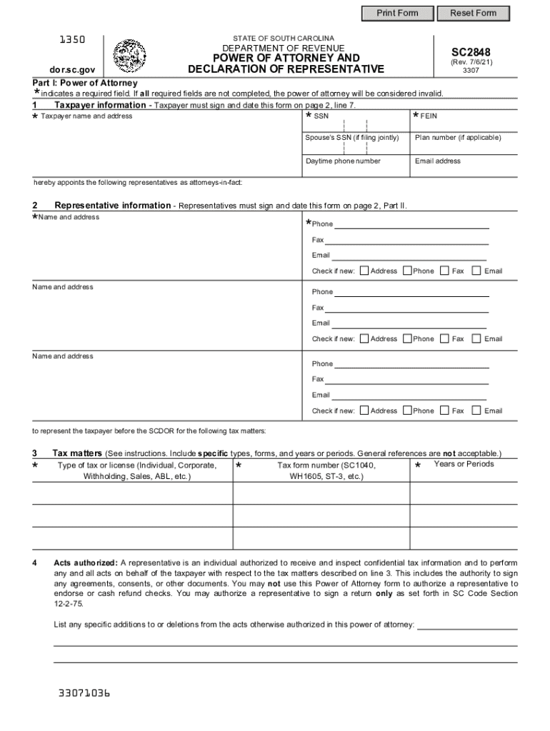 Print Form1350 for.SC.gov Part I: Power of AttorneyReset Formulate OF SOUTH CAROLINADEPARTMENT OF REVENUESC2848POWER OF ATTORNEY AND DECLARATION OF REPRESENTATIVE(Rev. 7/6/21) 3307a required field.