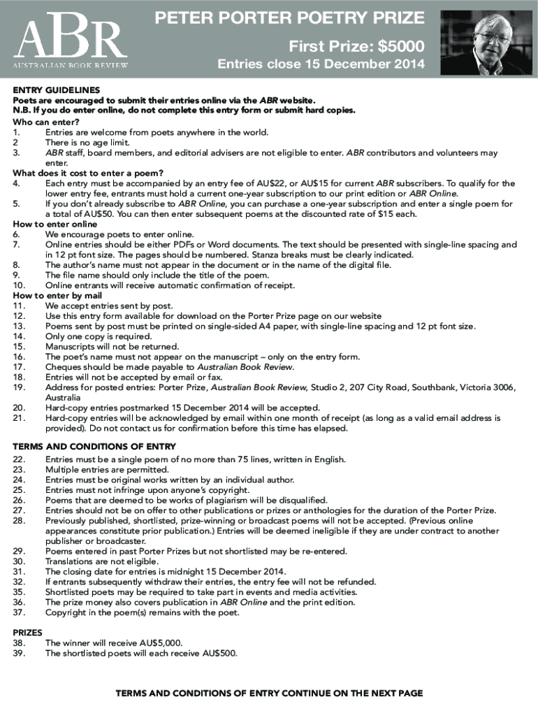 Peter porter poetry Prize First Prize: $5000 Entries close 15 December 2014 Entry Guidelines Poets are encouraged to submit their entries online via the ABR website. N.B. If you do enter online, do