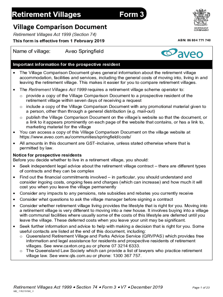 This form is effective from 1 February 2019Name of village:ABN: 86 804 771 740Aveo SpringfieldImportant information for the prospective resident The Village Comparison Document gives general information