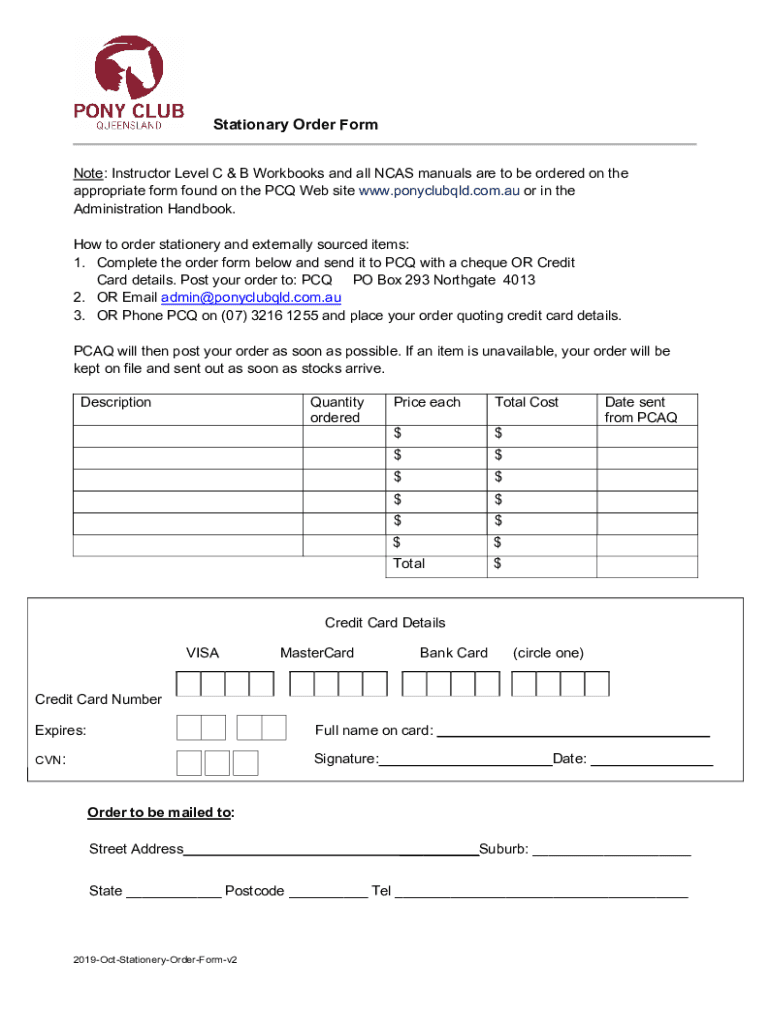 Stationary Order Form Note: Instructor Level C & B Workbooks and all NCAA manuals are to be ordered on the appropriate form found on the PC Website www.ponyclubqld.com.au or in the Administration
