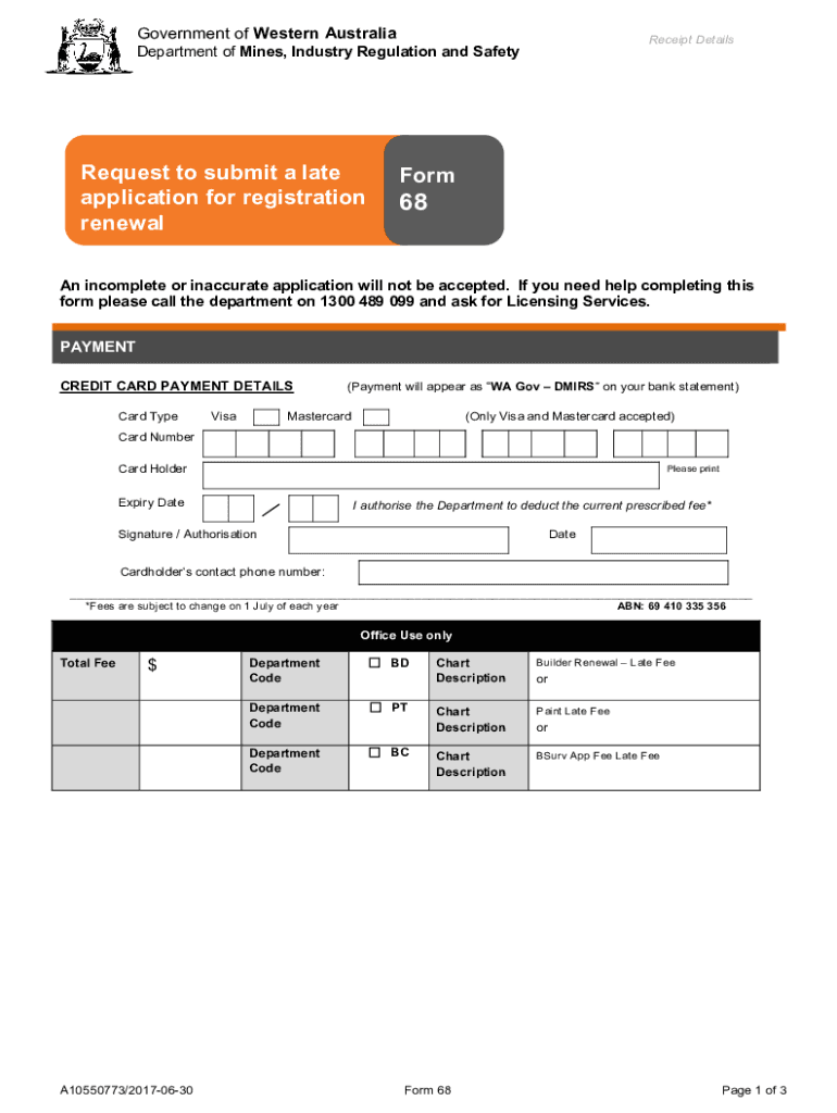 Government of Western AustraliaReceipt DetailsDepartment of Mines, Industry Regulation and SafetyRequest to submit a late application for registration renewalForm68An incomplete or inaccurate application