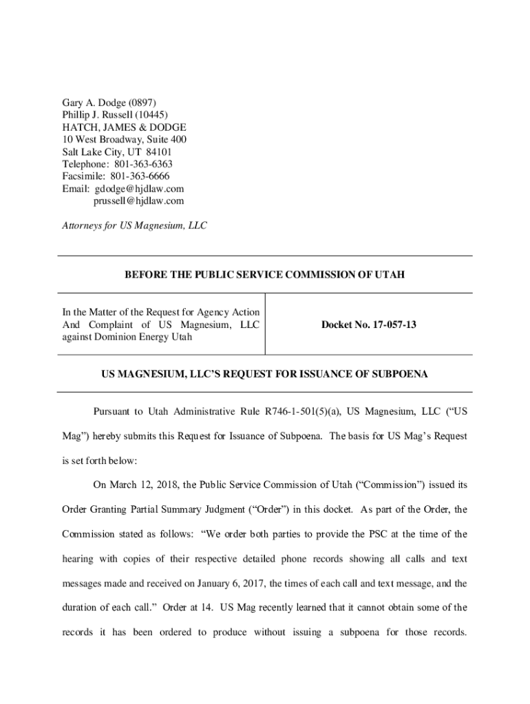 Gary A. Dodge (0897) Phillip J. Russell (10445) HATCH, JAMES & DODGE 10 West Broadway, Suite 400 Salt Lake City, UT 84101 Telephone: 8013636363 Facsimile: 8013636666 Email: Dodge hjdlaw.com Russell