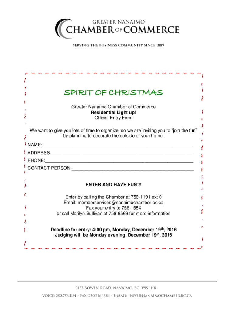 SPIRIT OF CHRISTMAS Greater Nanaimo Chamber of Commerce Residential Light up! Official Entry Form We want to give you lots of time to organize, so we are inviting you to join the fun by planning to
