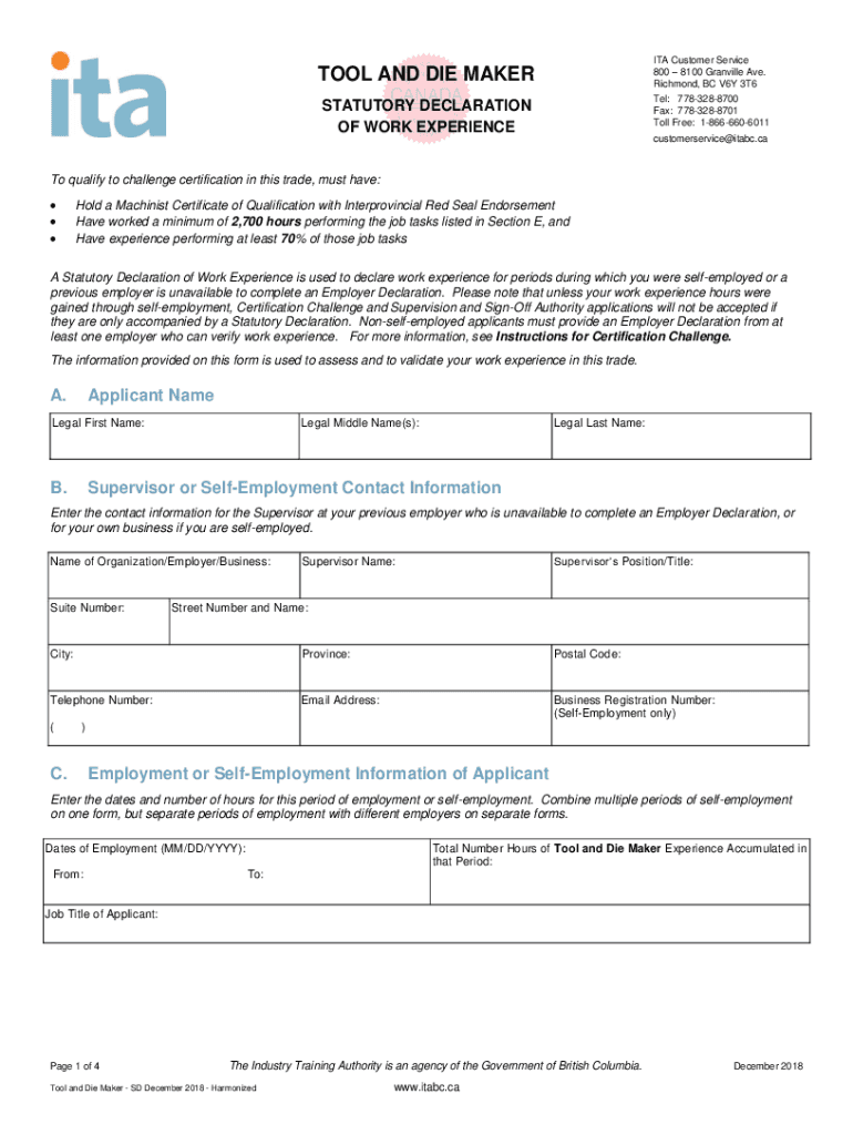 ITA Customer Service 800 8100 Granville Ave. Richmond, BC V6Y 3T6TOOL AND DIE Mackerel: 7783288700 Fax: 7783288701 Toll Free: 18666606011STATUTORY DECLARATION OF WORK EXPERIENCEcustomerservice@itabc.caTo